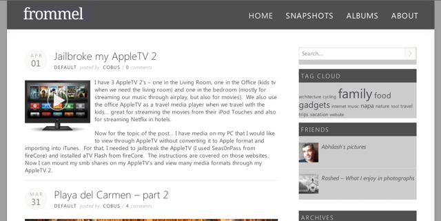 I created frommel.net in the late 90’s to share my pictures and some cool things I saw on the web with friends and family. For a long time, I used pivot as a blogging platform and gallery as my photo repository. Both were based on php and I spent quite some time customizing them to my liking. In 2011 I started using facebook more and more for sharing my interesting links and also one-off pictures (photo blogging mostly). And with facebook’s new timeline feature, it felt more and more like a viable personal blogging platform. I rarely updated frommel.net any more and my photo gallery was lagging behind. I considered abandoning frommel.net and focusing on some ‘best of breed’ solutions for my blogging and my photos, since it would be more likely to reach my friends and family if they were active users of those best of breed services. Here is the shortlist of what I considered.